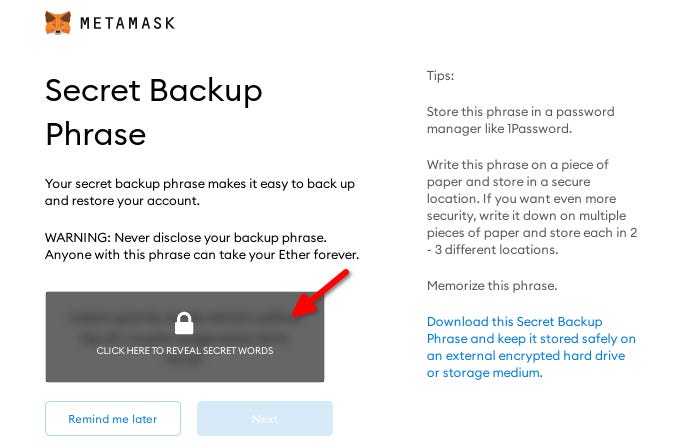 Click on the grey area to unlock your seed phrase. Be sure to store this seed phrase safely.