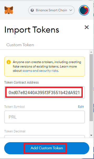After you’ve pasted the address of the token, the “PRL Symbol” and the “Token Decimal” field should be auto-populated.